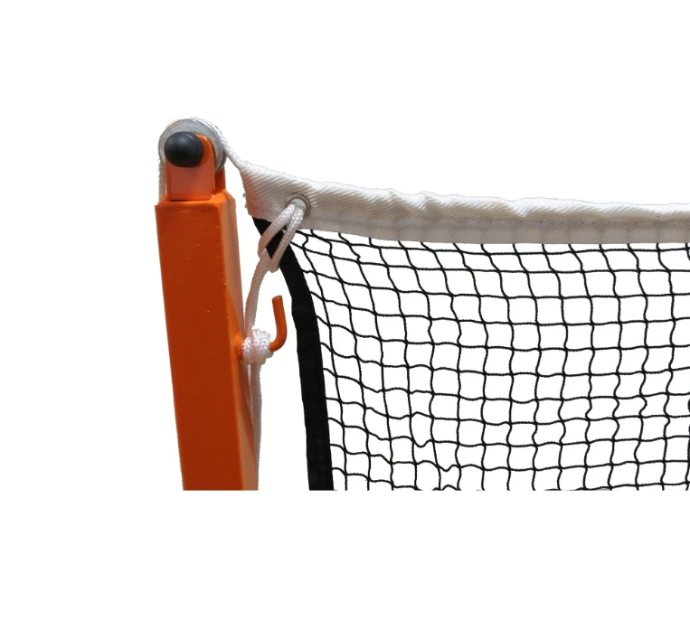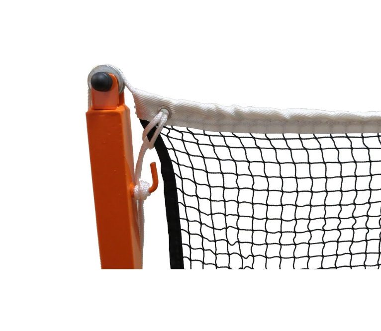 Сетка натягивается между двумя стойками для сетки для бадминтона, крепится к стойкам с помощью тросов или верёвок. Стойки для крепления бадминтонной сетки должны быть расположены за пределами боковых линий корта.