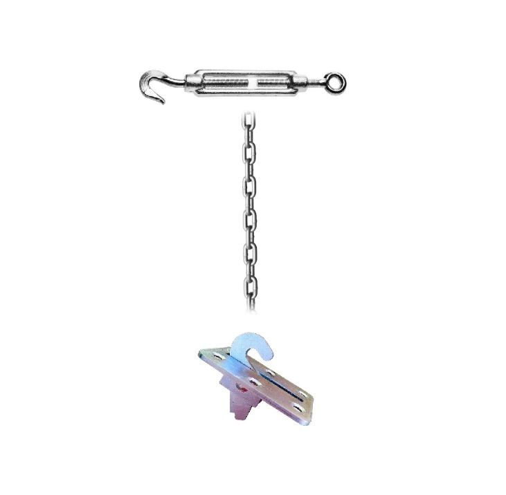 Комплектация: стальная пластина с крюком, цепь, талреп для натяжения, саморезы по дереву.